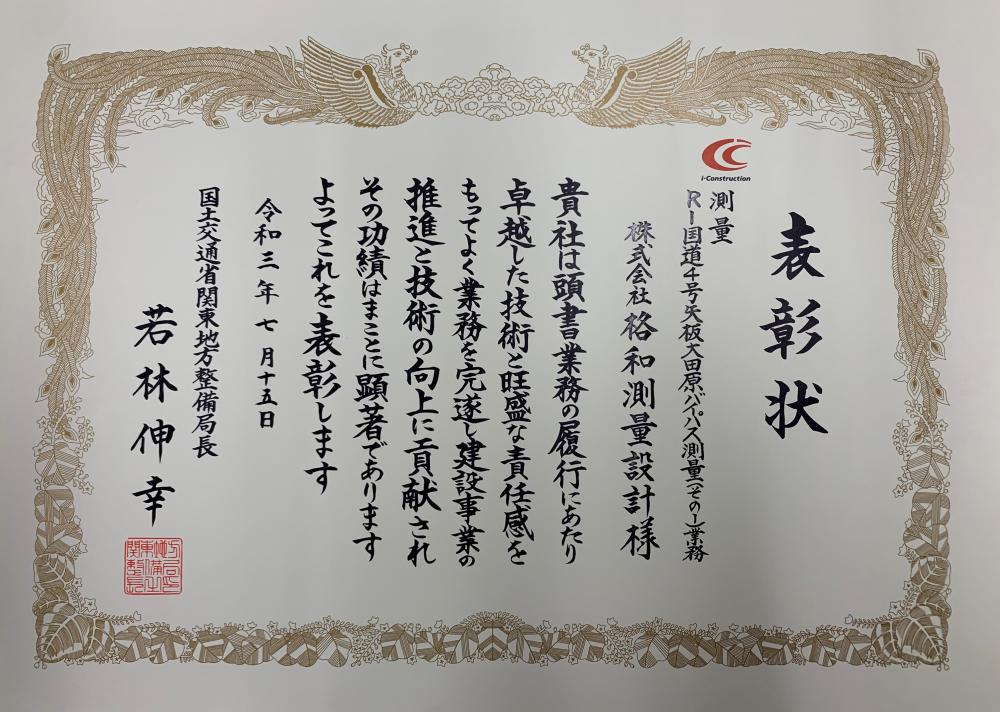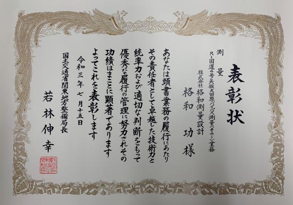 この度、弊社が昨年度実施した宇都宮国道事務所発注のR1国道4号矢板大田原バイパス測量(その1)業務において、国土交通省関東地方整備局長より優良業務及び優秀技術者表彰を受賞致しました。(管内全体の対象業務1618件のうち83件が表彰)昨年に続き2年連続の局長表彰となりました。